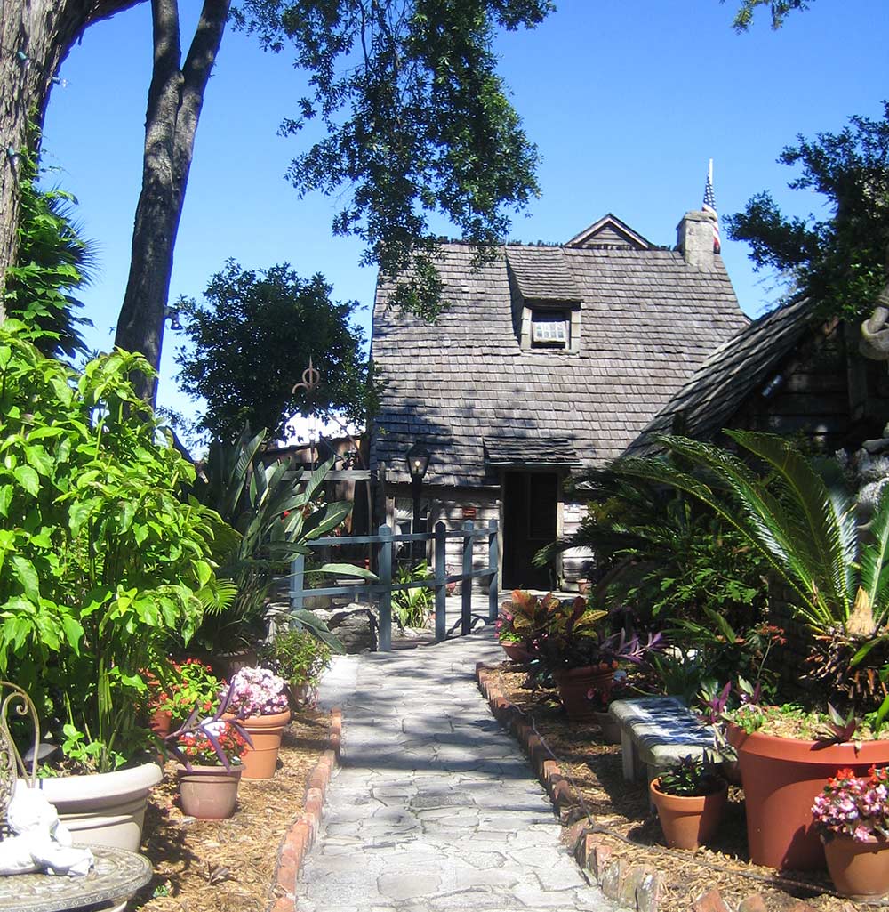 No wooden structures in St. Augustine built prior to the year 1702 still stand because the British burned Spanish St. Augustine to the ground in that year. Tax records indicate that the wooden school house was present in 1716 and was built for the Genoply family. Located in the "Minorcan Quarter," the original structure was a one-room, single-story building with a detached kitchen where food was made for the family to eat. Kitchens were commonly detached in those times to keep the house cool during the hot summer months and to prevent a fire that started in the kitchen from spreading to the house. A privy with a privacy wall was also kept away from the house, and so was the well. The house's exterior was made out of bald cypress and red cedar logs bound together by wood pins and iron spikes, all made by hand.